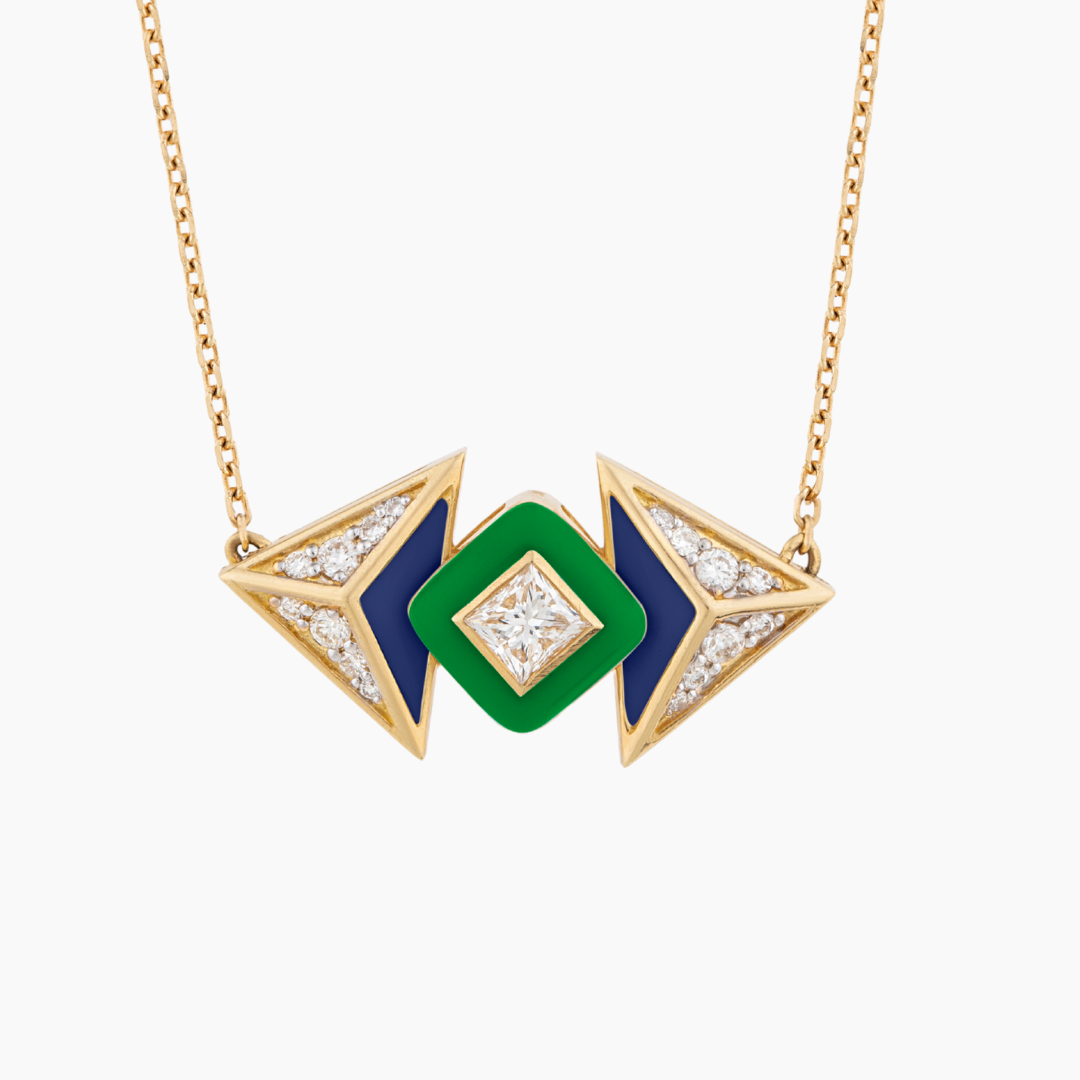 18kt yellow gold geometric shaped pendant. The triangles are crafted with royal blue enamel and white Diamonds and the square is coated with emerald green enamel set with princess cut Diamond in the center.