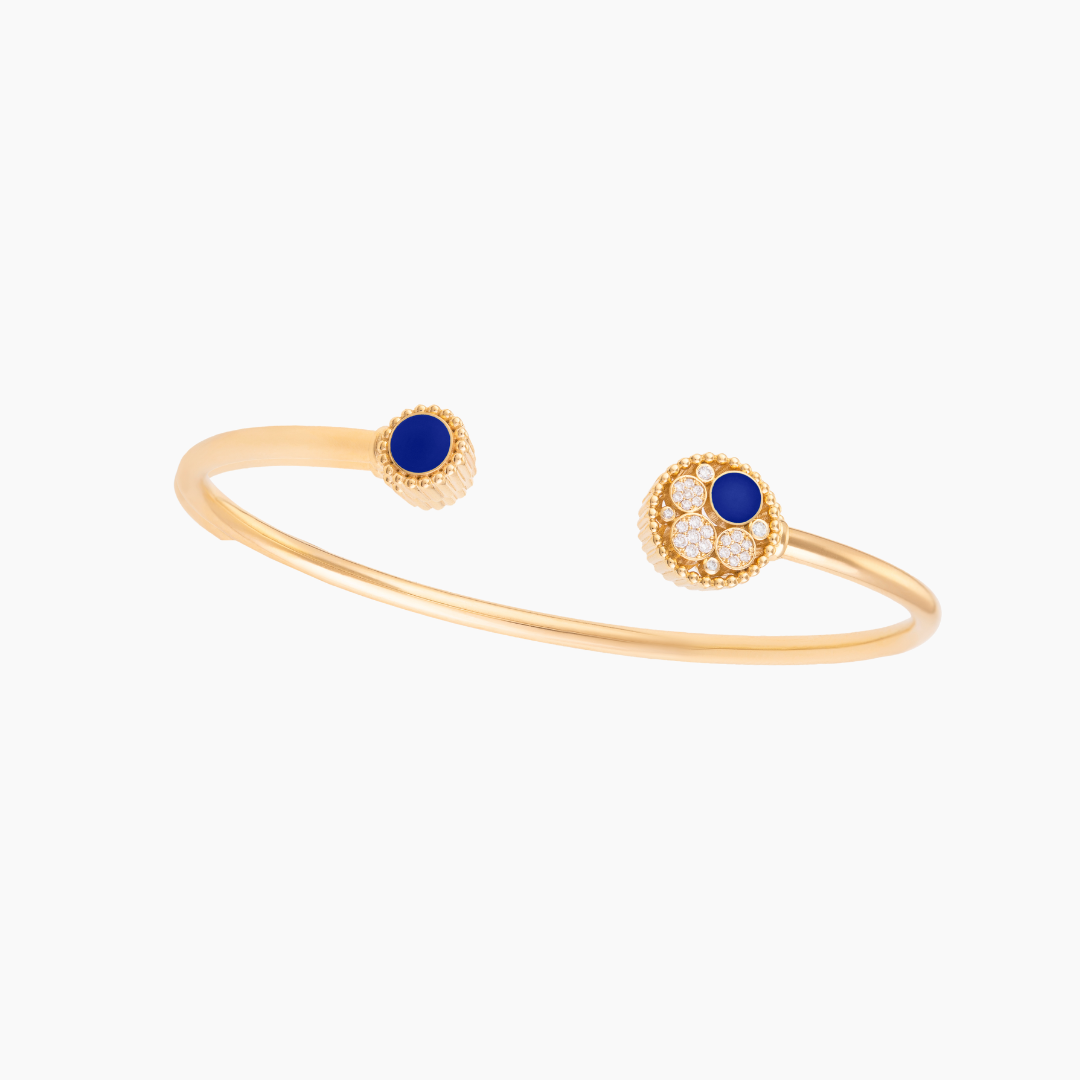 This elegant 18kt yellow gold bangle features a unique bubble design, adorned with vibrant lapis stones and sparkling diamonds. A perfect blend of modern artistry and timeless luxury.