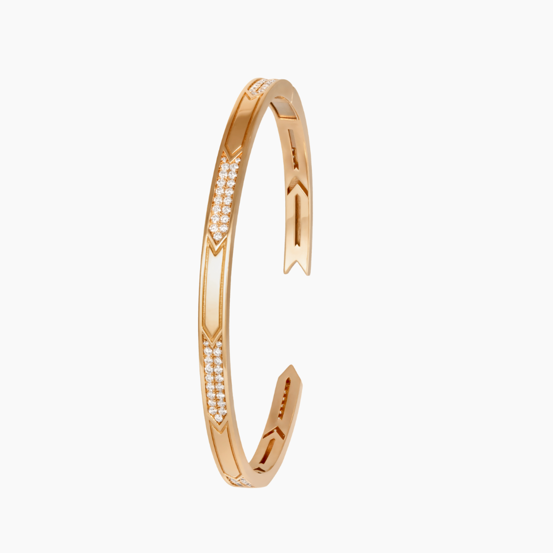 A sculptural expression of modern elegance, this diamond yellow gold bangle features bold geometric lines inspired by Art Deco architecture. A refined balance of strength and grace, designed for effortless everyday luxury.