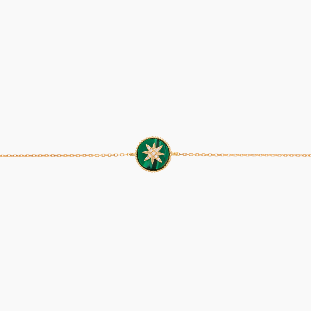 Elegant 18kt yellow gold bracelet featuring vibrant Malachite accented with 0.024C of sparkling white diamonds. Perfect for mixing, matching, and stacking with other bracelets from our collections to create a personalized, stylish look.