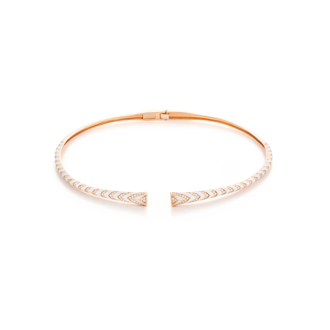 This 18kt yellow gold exquisite statement choker features bold, sleek lines, adorned with intricate patterns, sparkling diamonds, white enamel and often a central, eye-catching focal point. Its fusion of sophistication and striking design makes it a definitive statement choker for a glamorous and chic look.
