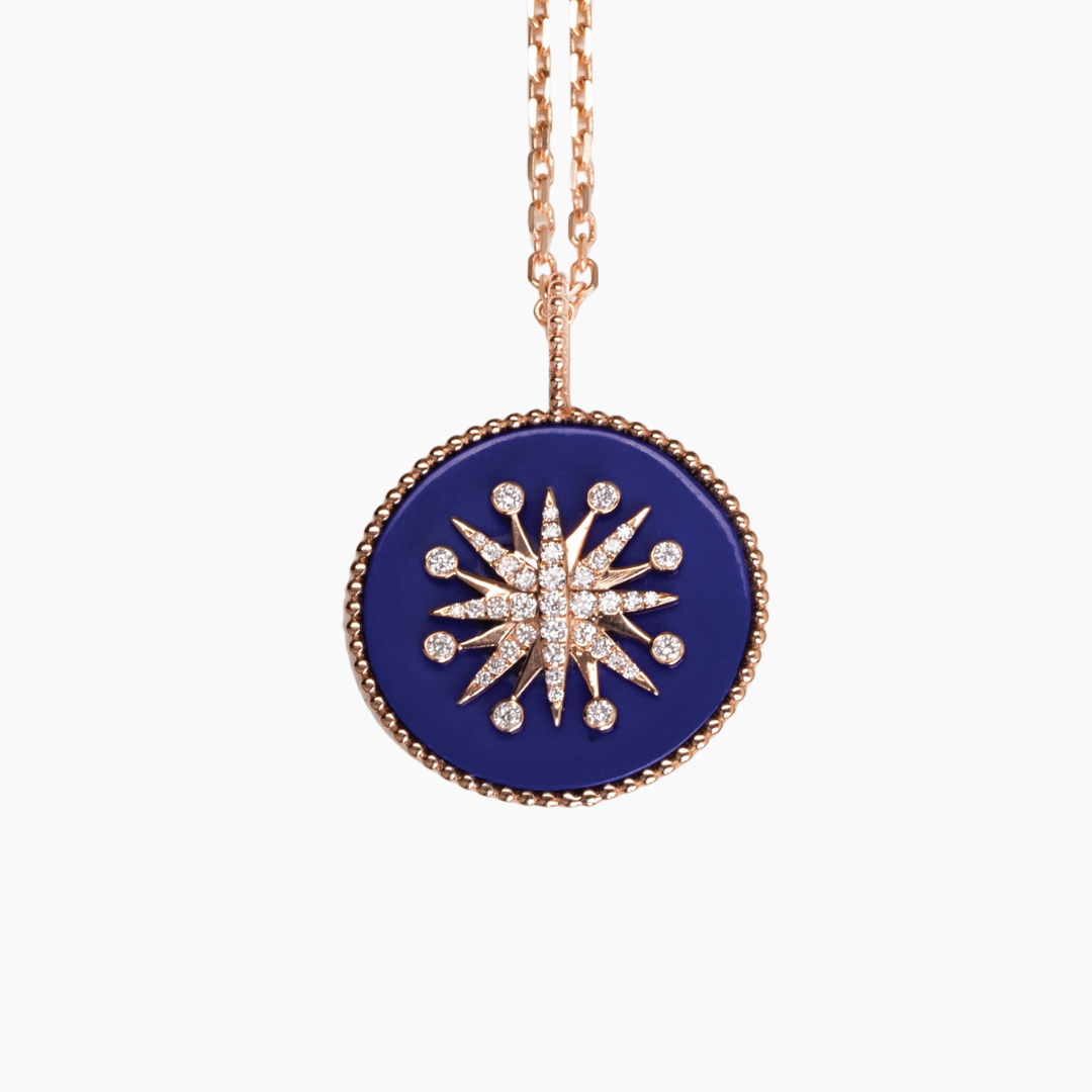 A bold fusion of deep color and radiant brilliance, this yellow gold necklace features a captivating Lapis center accented with a sparkling diamond splash motif. Set with 0.17 carats of white diamonds, the design highlights the rich intensity of Lapis — a stone symbolizing wisdom and strength — contrasted beautifully against the warmth of 18kt gold.