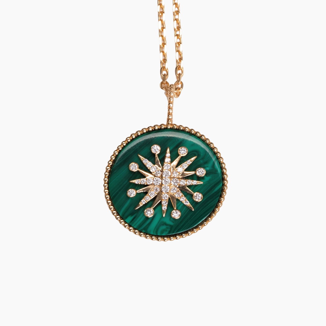 A captivating blend of natural elegance and modern design, this yellow gold necklace showcases a rich green malachite centerpiece adorned with a radiant diamond splash motif. Encrusted with 0.17 carats of white diamonds, it reflects light beautifully while celebrating the organic depth and energy of malachite.