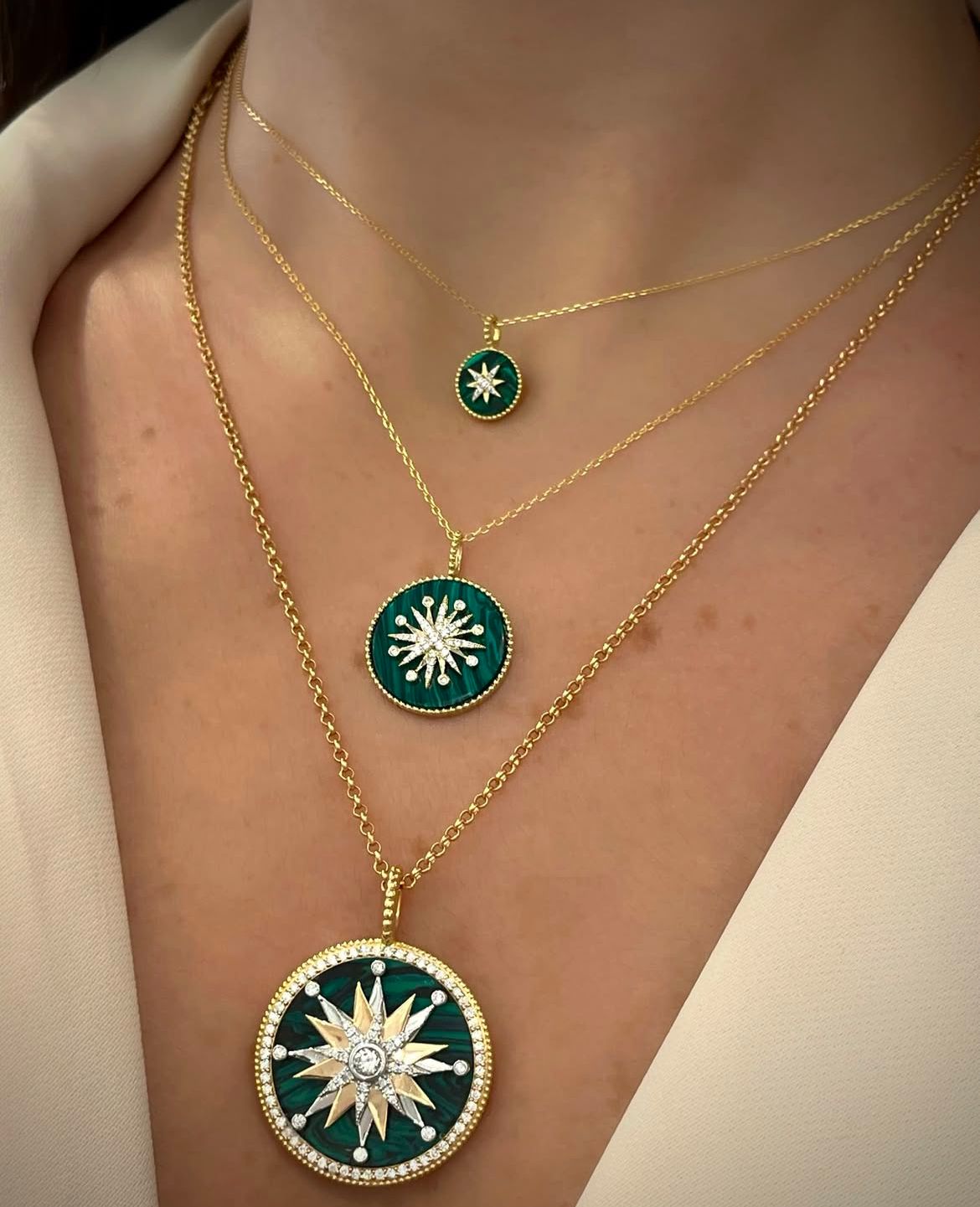 Elevate your style with the mini diamond splash pendant. Made of 18kt gold, malachite and diamonds.