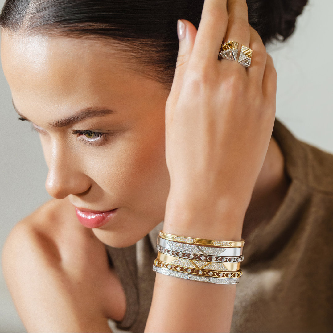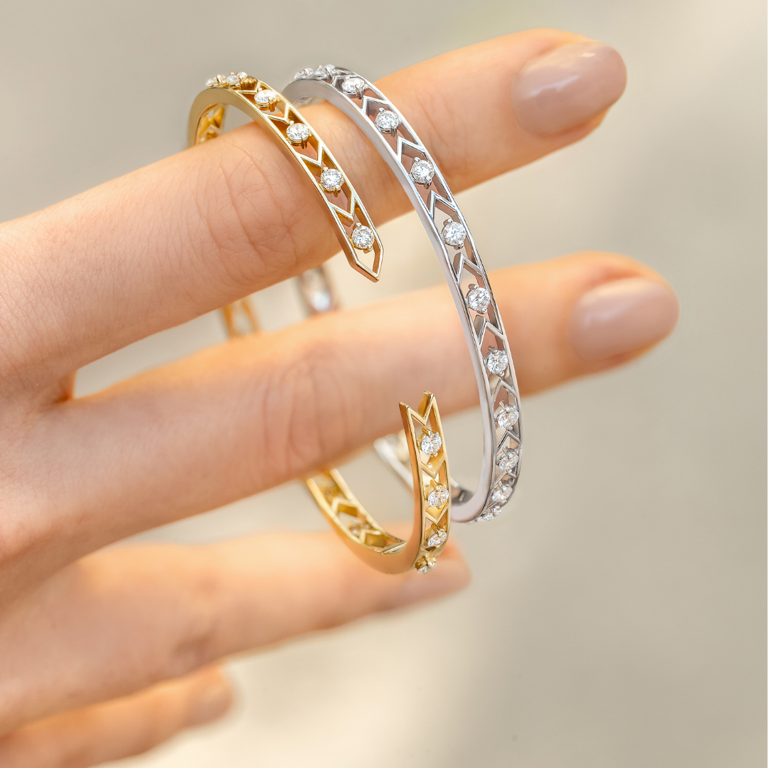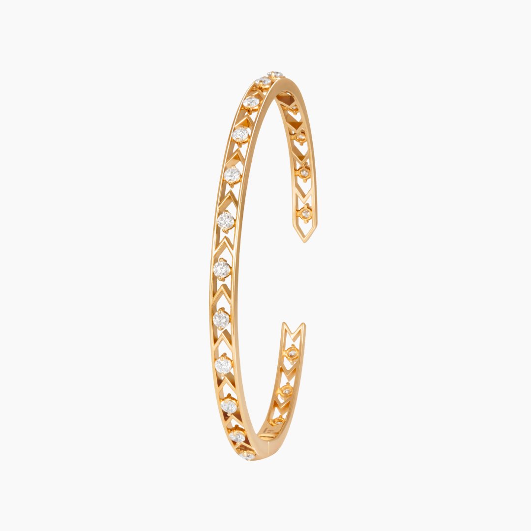 From the Dualities Collection, this diamond bangle is a striking expression of strength and softness in perfect balance. Crafted in luminous yellow gold and accented with brilliant diamonds, the design draws inspiration from the bold, architectural geometry of Art Deco, expressed through elegant chevron motifs and a refined open silhouette.