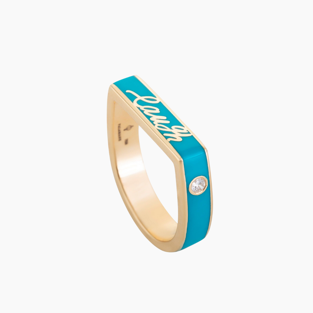 18kt yellow gold laugh ring with turquoise enamel and white Diamonds on the sides.
