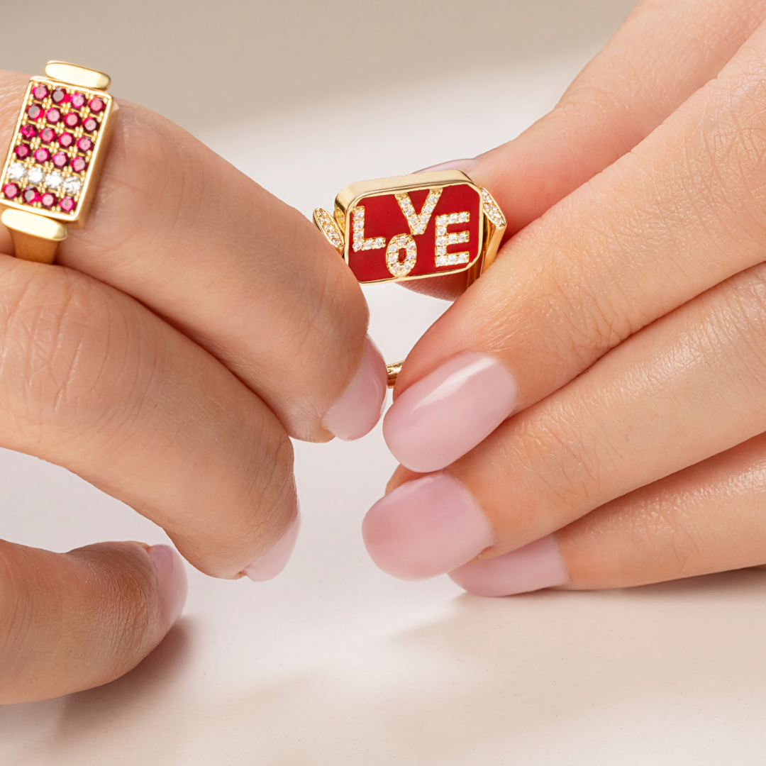 Adorn your finger with elegance and versatility. Our reversible 18kt yellow gold diamond rings offer double the sparkle and style, seamlessly transitioning between two captivating designs, crafted with red enamel and diamonds on one side and heart shaped design with diamonds on the other side.