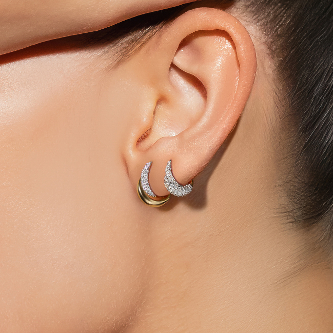 Part of the Dualities Collection, these elegant small stud earrings embody contrast and harmony through fluid form and refined sparkle. Crafted in radiant 18kt yellow gold, the sculptural crescent silhouette is beautifully paired with a curved row of brilliant-cut diamonds, creating a striking balance between softness and brilliance. Designed in a small size, they offer effortless everyday elegance while adding a subtle statement of modern luxury. Perfect for solo wear or layering, these earrings transition seamlessly from day to evening.