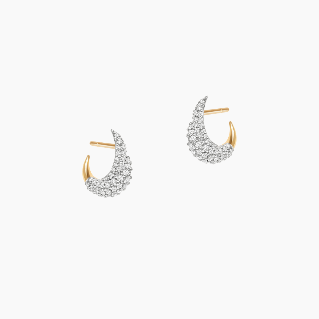 From the Dualities Collection, these small full diamond stud earrings embody the ultimate expression of contrast and brilliance. Expertly crafted in luminous 18k yellow gold, the sculptural crescent silhouette is fully encrusted with brilliant-cut diamonds, delivering exceptional sparkle from every angle. Designed in a small size, they offer a refined yet striking look, perfect for elevating everyday wear or adding subtle luxury to evening styling. A timeless piece that balances bold radiance with modern elegance.