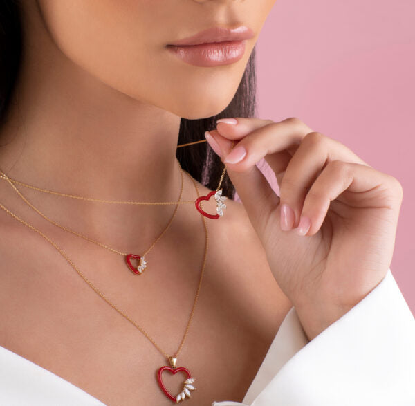Radiate love and elegance with this large 18kt yellow gold heart-shaped pendant, coated in deep red enamel and adorned with 0.77ct of Marquise Diamonds. A timeless piece that celebrates 12 months of love, tenderness, and togetherness.