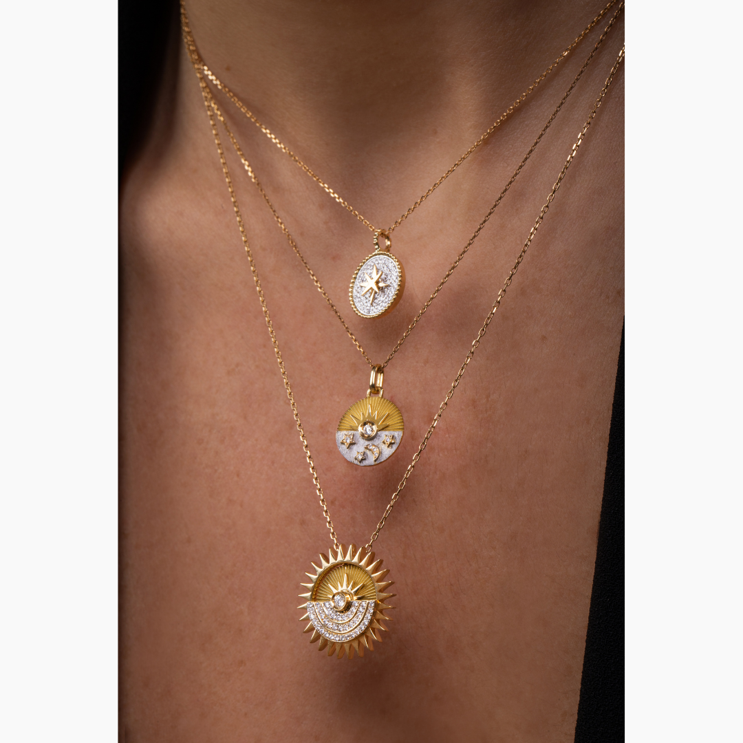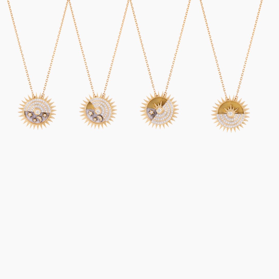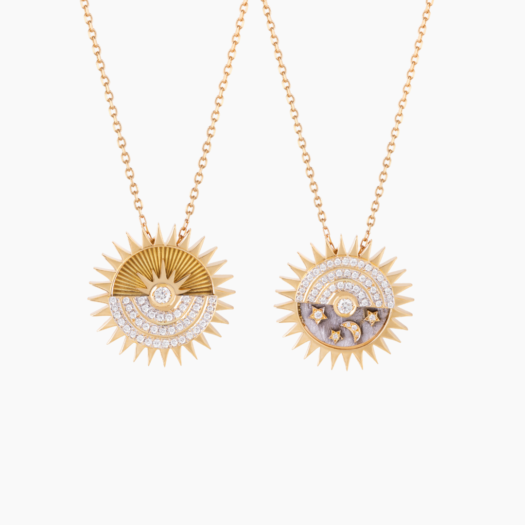 This dynamic pendant allows the wearer to switch between celestial symbols, making it a versatile and meaningful piece.