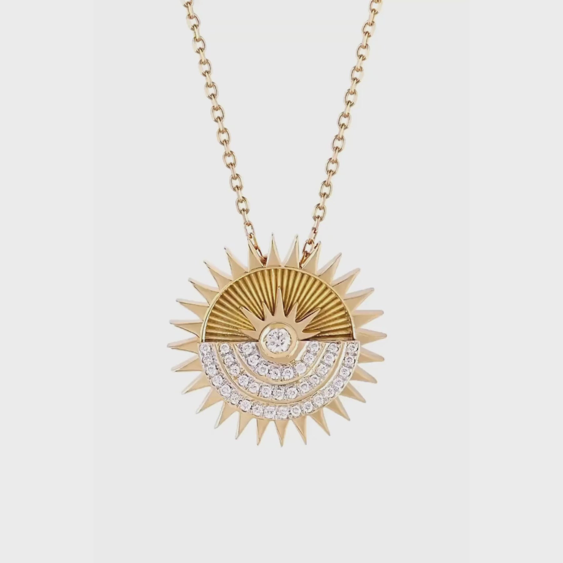 This exquisite Soleil Turning Pendant is crafted in 18kt yellow gold, featuring a reversible sun and moon design. One side showcases a radiant sun motif, symbolizing warmth, energy, and vitality, with brilliant diamond accents. The other side reveals a serene moon and stars motif, embodying mystery, calmness, and night’s beauty, also adorned with diamonds.