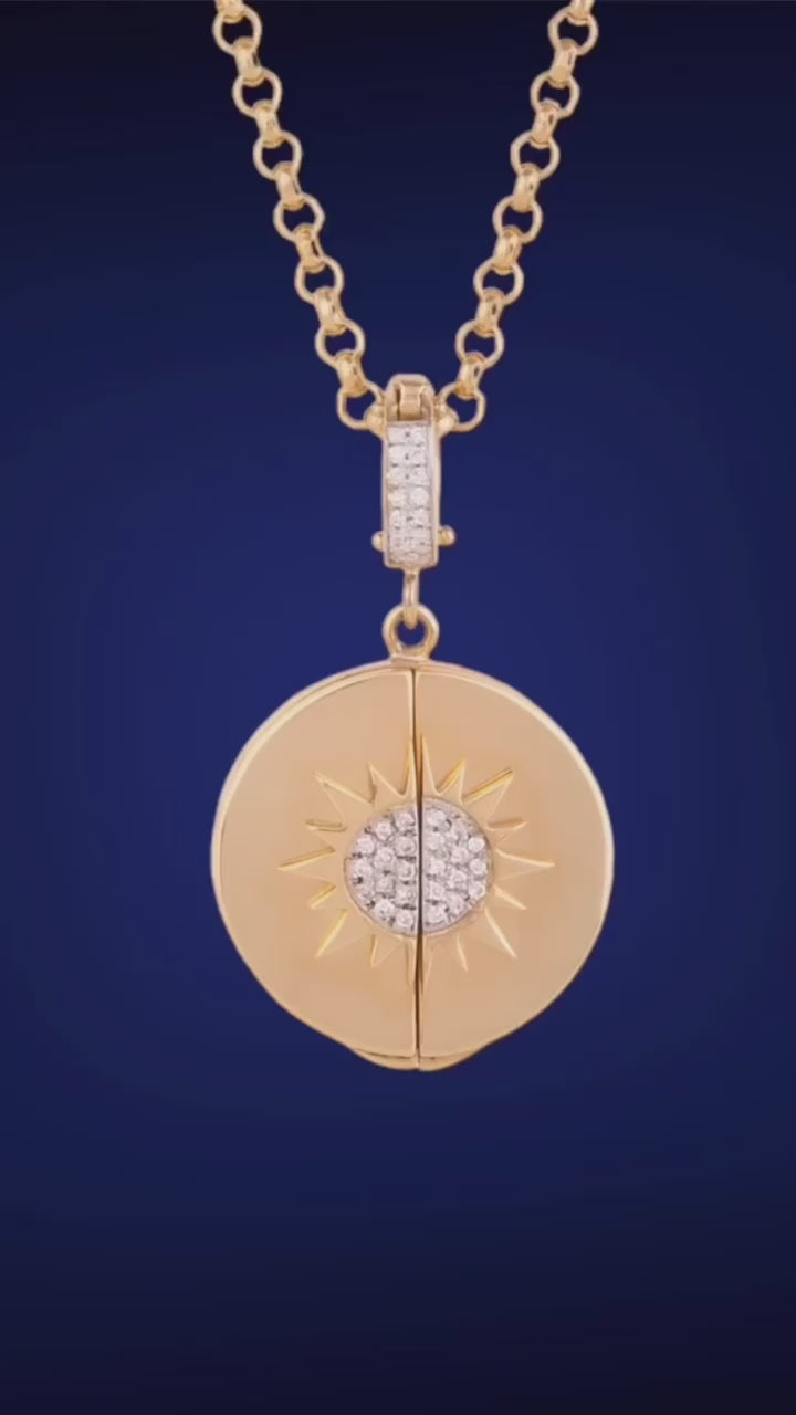 This locket pendant is made of 18kt gold. It has an elegant sun design from the outside, set with white Diamonds, and Allah from the inside crafted with royal blue enamel.
