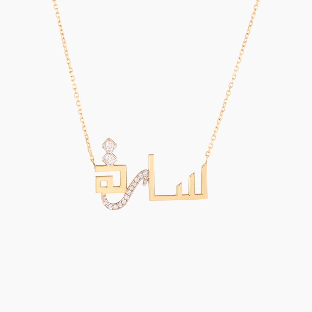 18kt yellow gold personalized calligraphy necklace with white Diamonds.