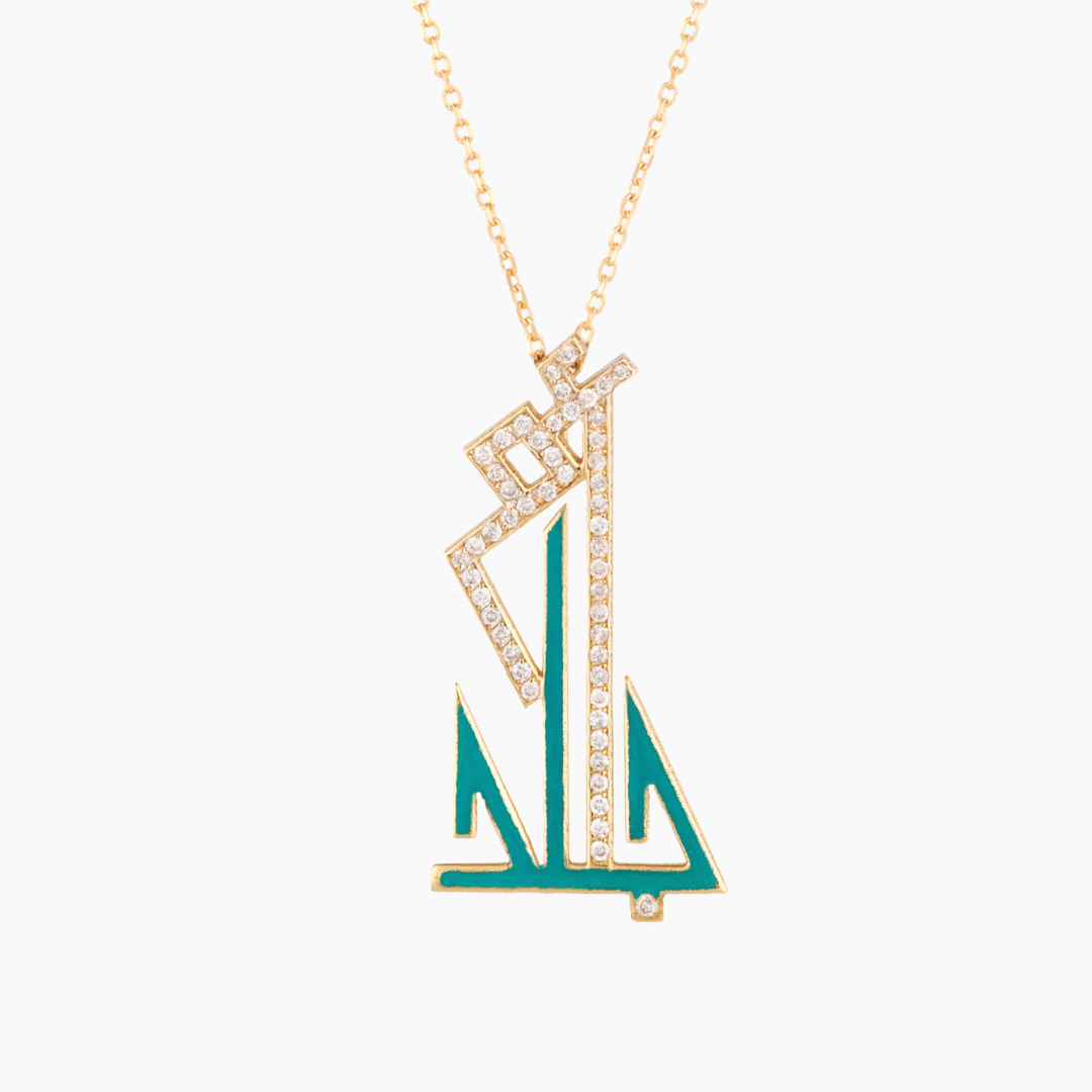 18kt yellow gold personalized calligraphy necklace with enamel and white Diamonds.