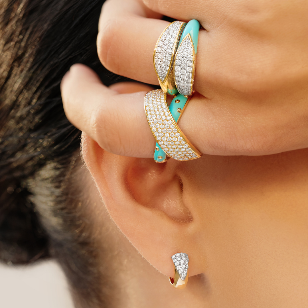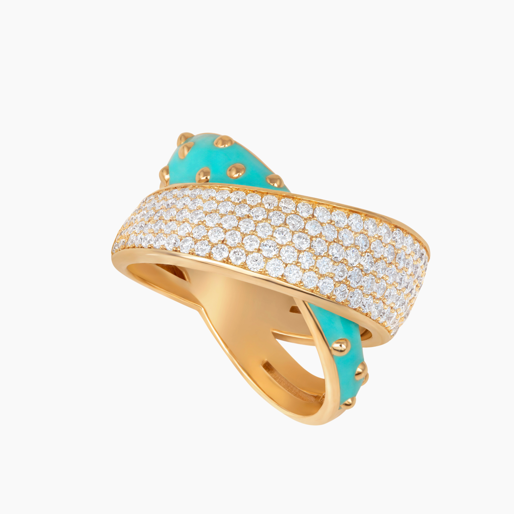 A striking statement of color and brilliance, this elegant ring is crafted in 18kt yellow gold and accented with vibrant turquoise, beautifully contrasted by a surface fully adorned with brilliant-cut diamonds totaling 1.13 carats. The bold turquoise hue brings freshness and vitality, while the diamonds add exceptional sparkle and refined luxury.