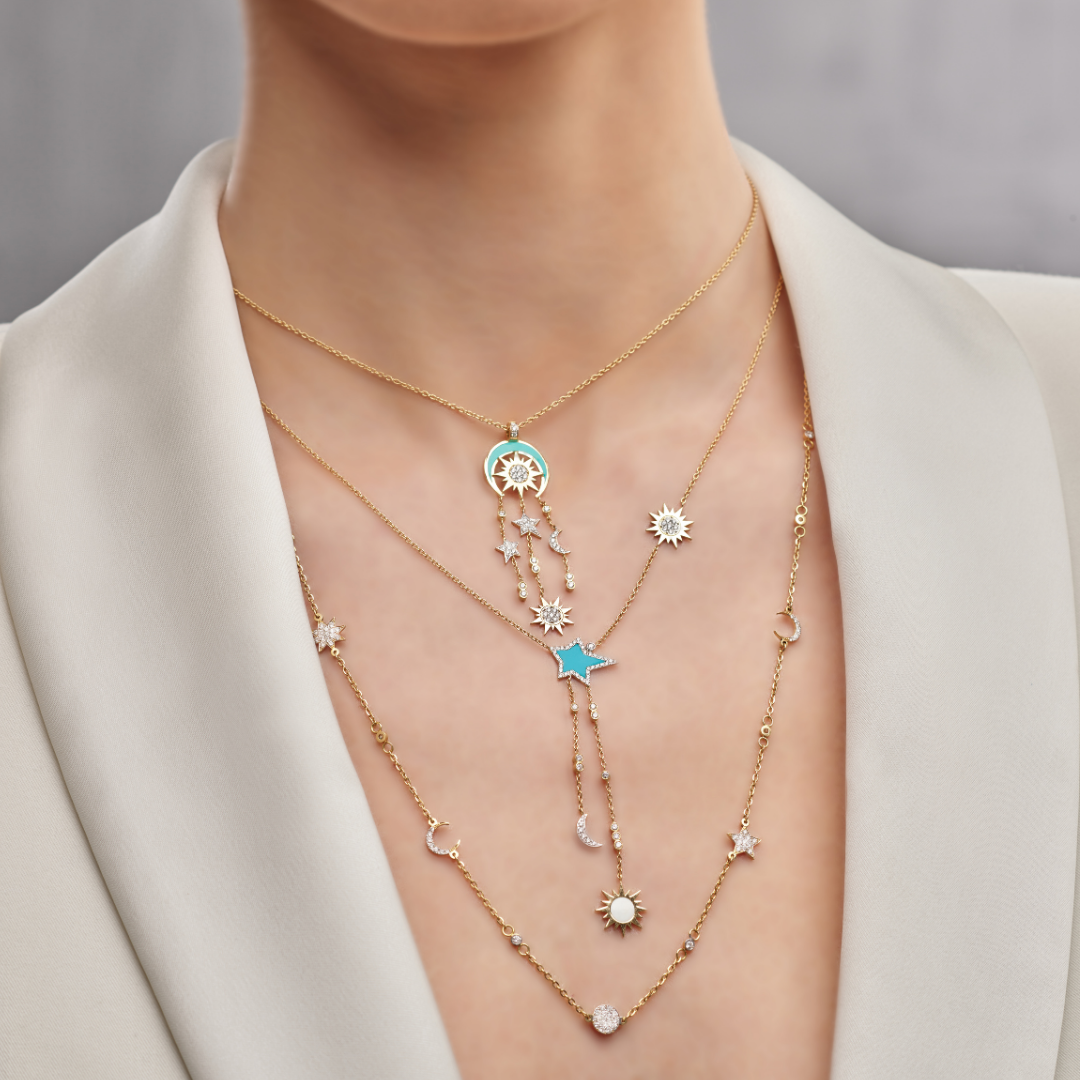 Finely made, 18kt yellow gold, modern moon and stars necklace with dangling charms on chain, set with white Diamonds, crafted with the turquoise enamel.
