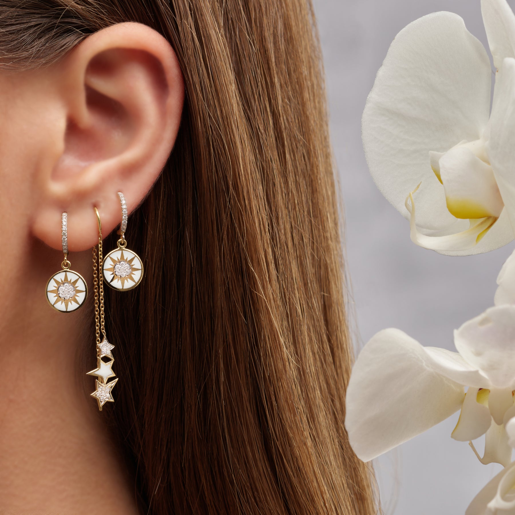 18kt yellow gold sun hoop earrings with white enamel and white Diamonds.