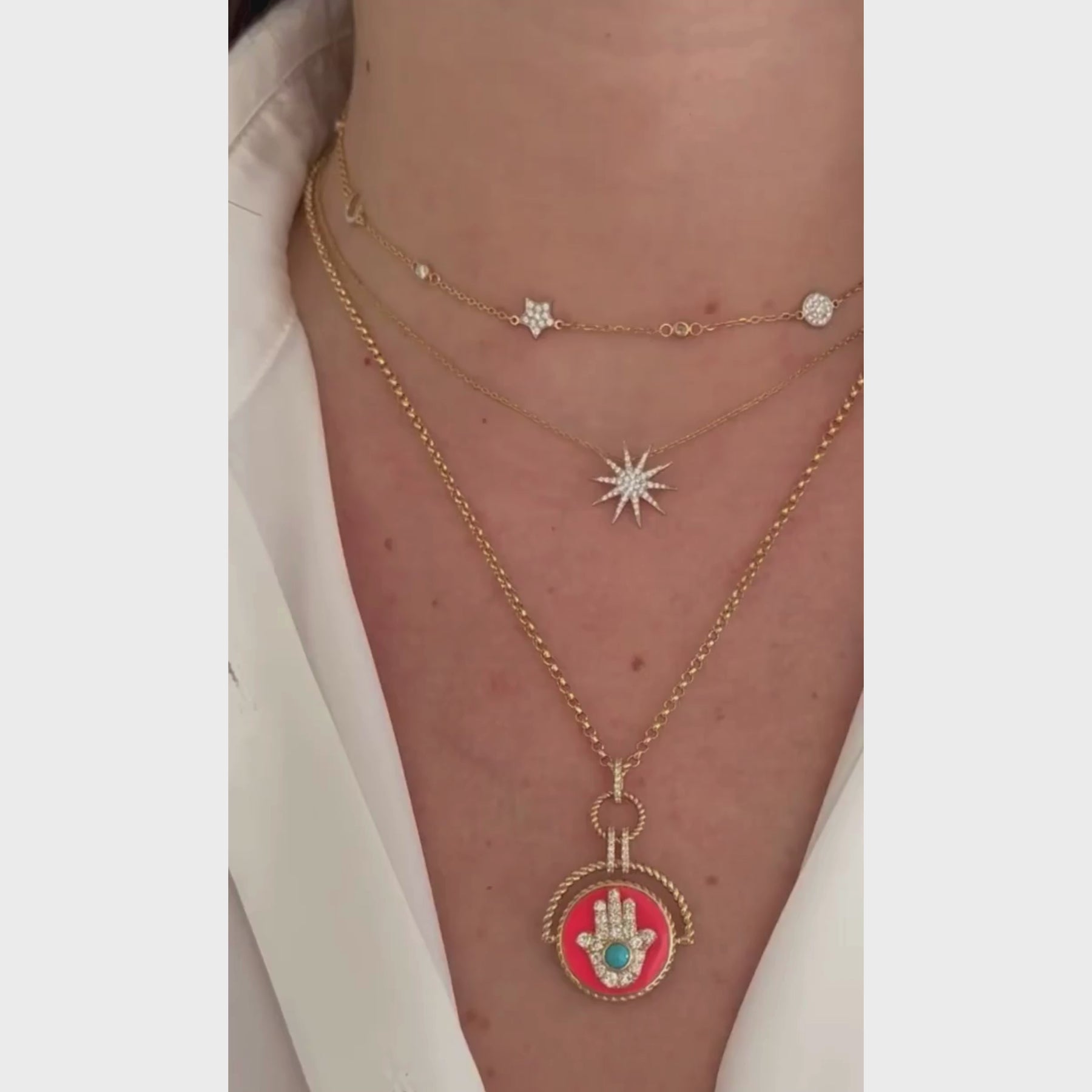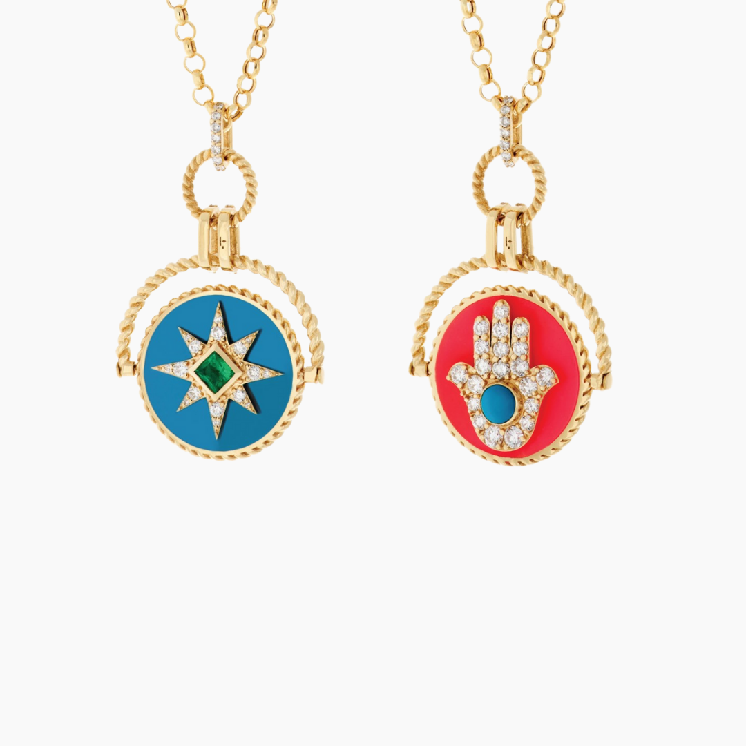 18kt yellow gold double sided pendant. One side features the star set with white Diamonds, Emerald cut Emerald in the center and Turquoise enamel in the background and the other side hand of Fatima set with white Diamonds and Turquoise in the center.