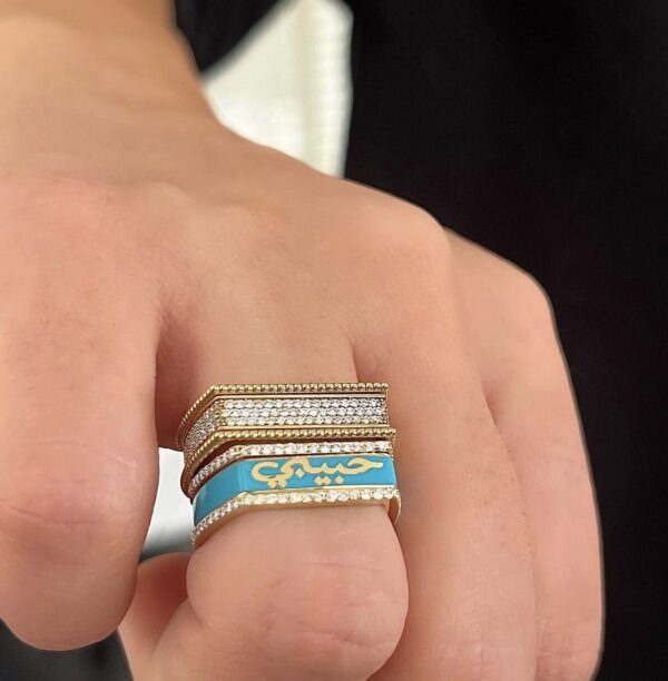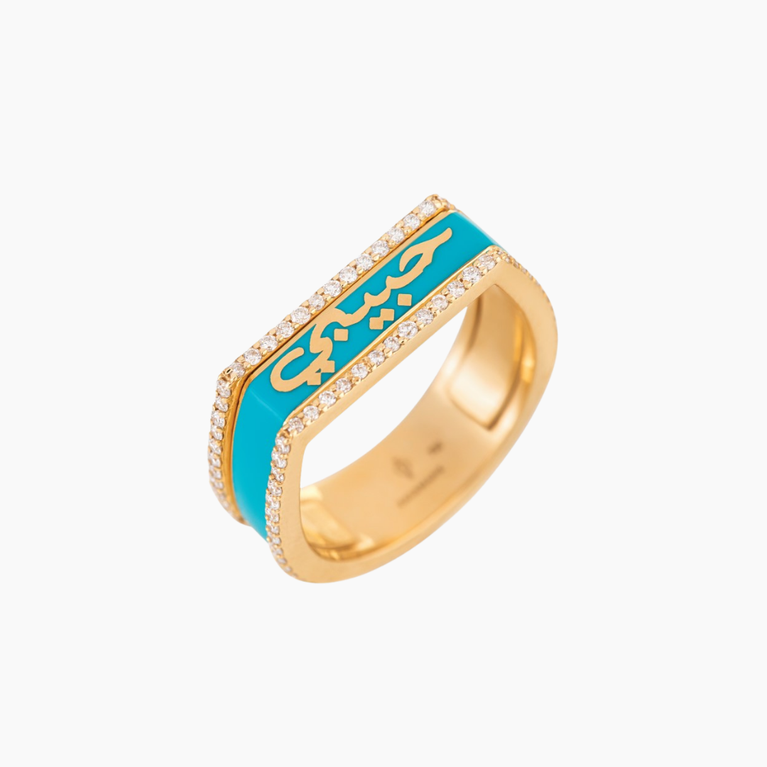 18kt yellow gold interchangeable love ring with turquoise enamel and white Diamonds.