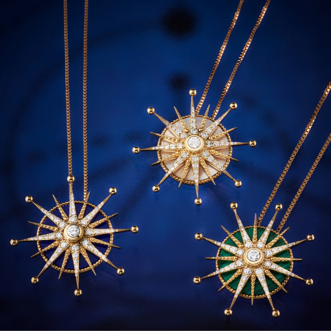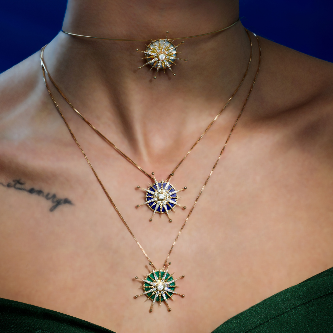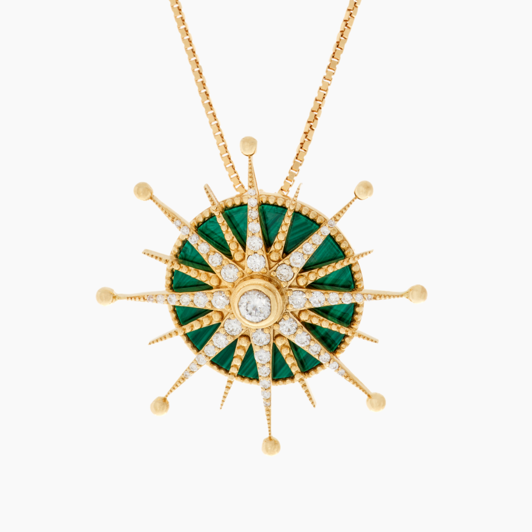 18kt yellow gold star necklace, with Malachite and white Diamonds.