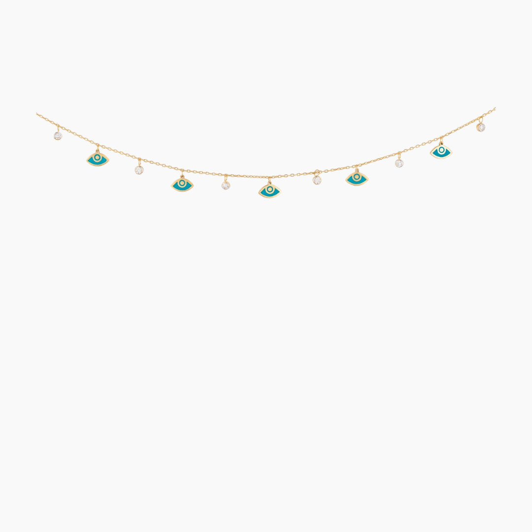 18kt yellow gold evil eye chocker necklace with turquoise enamel and white Diamonds.