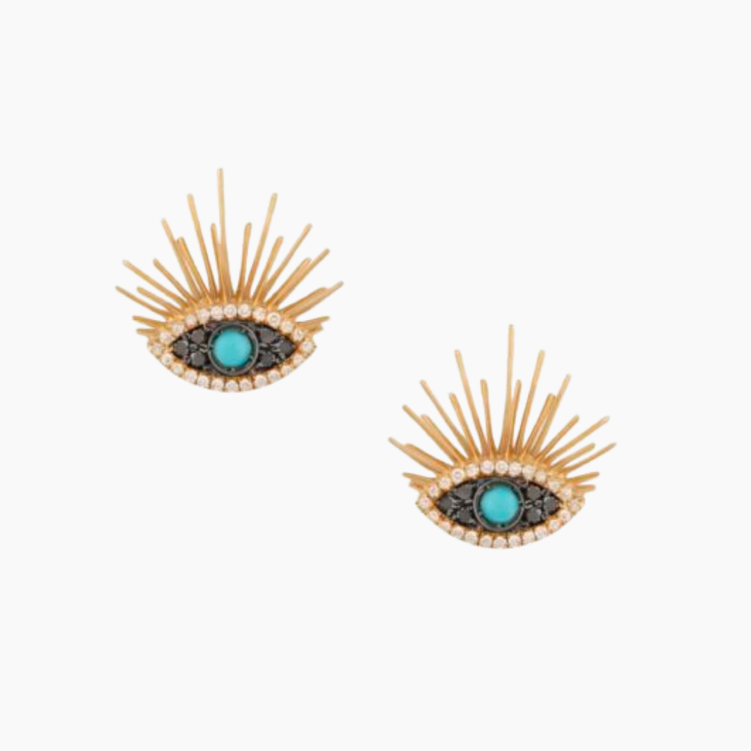 18kt yellow gold evil eye earrings with Turquoise, black and white Diamonds.