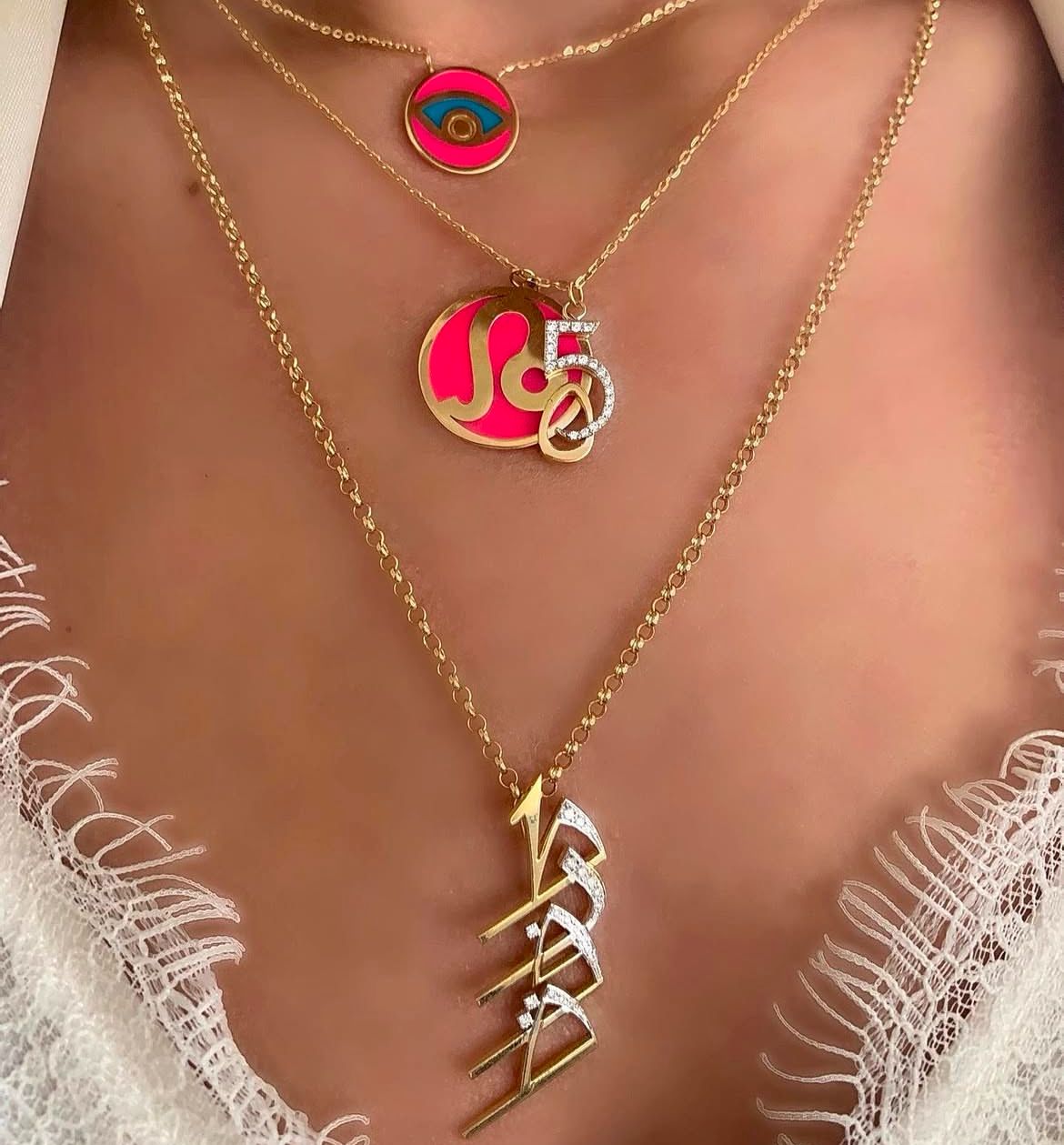 18kt yellow gold evil eye charm necklace with enamel.