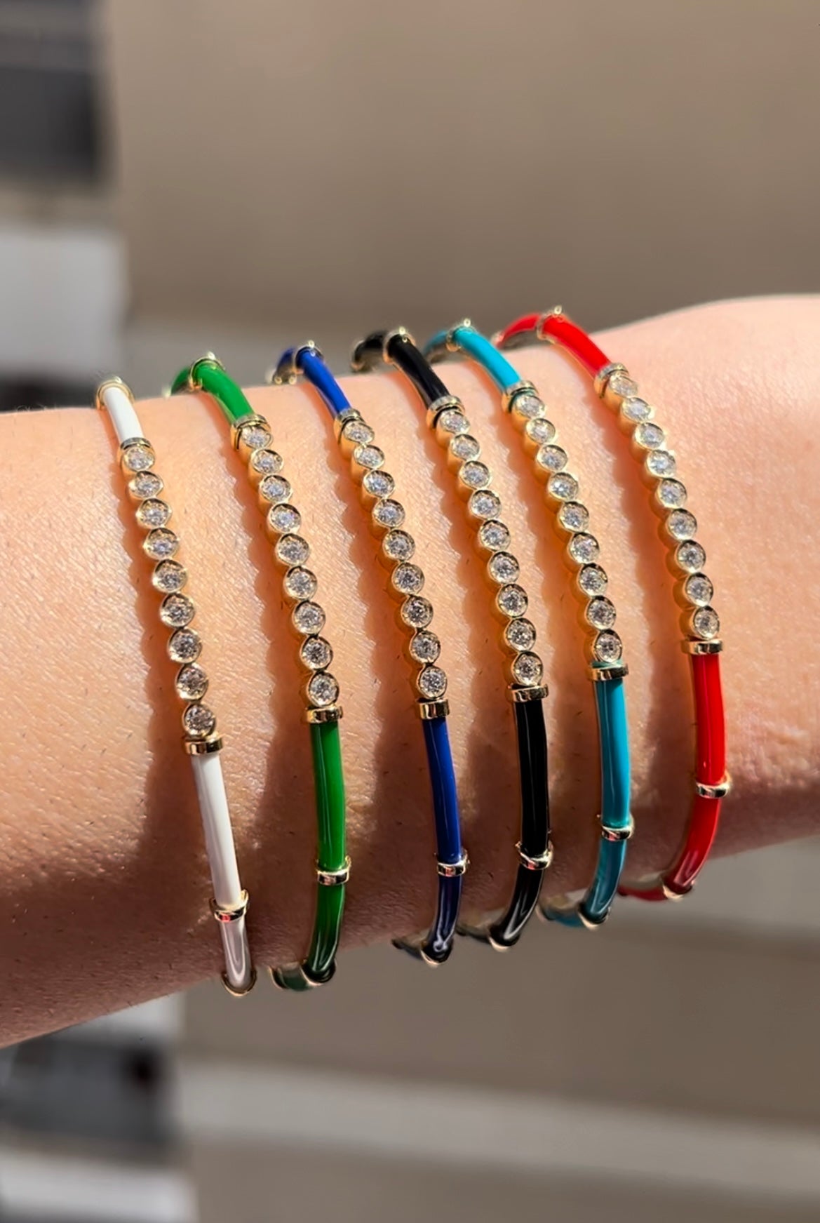 18kt yellow gold dainty bracelet coated with black enamel and white Diamonds in the center.