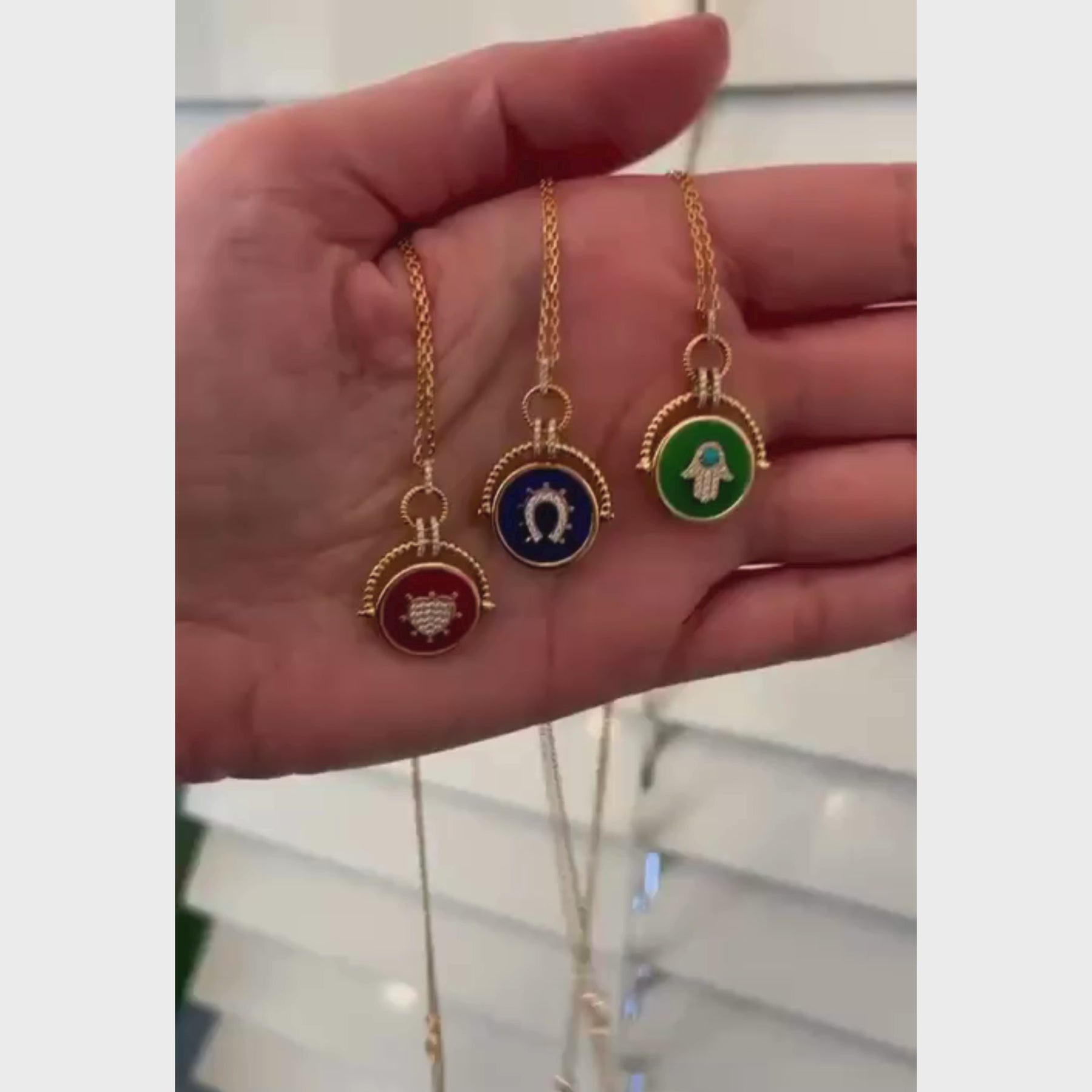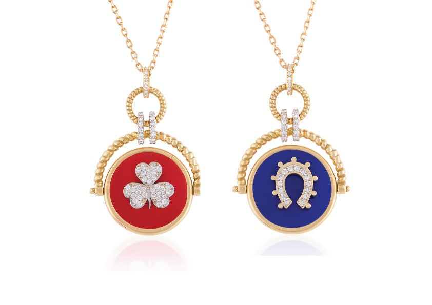 18kt yellow gold double sided pendant. One side features a horseshoe set with white Diamonds and blue enamel in the background and the other side a flower set with white Diamonds and red enamel in the background.