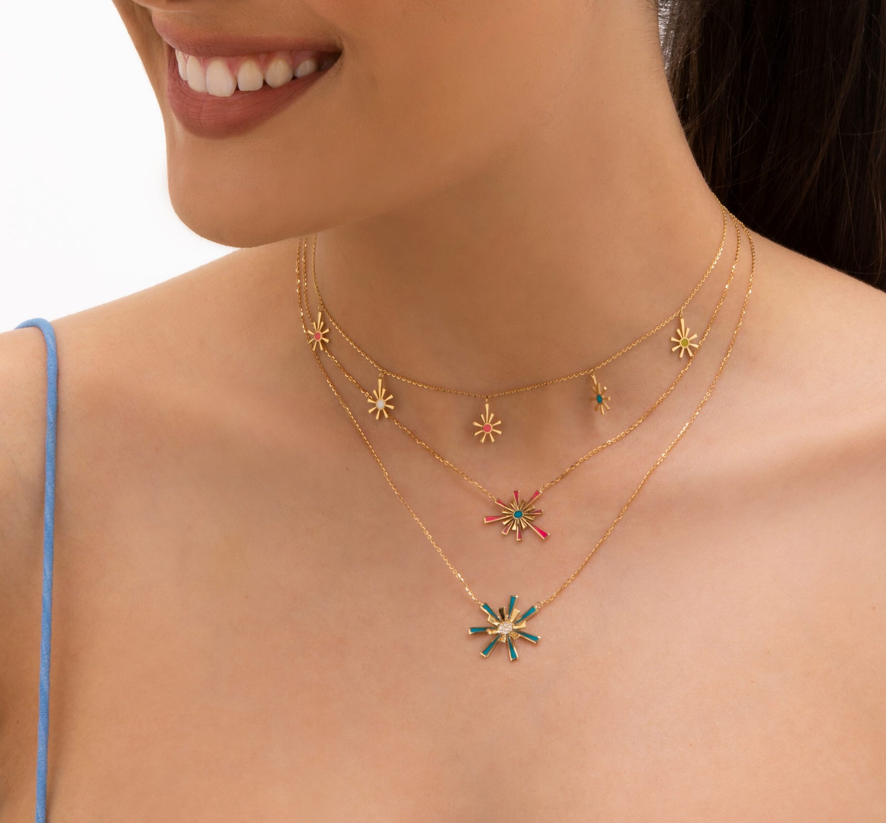 18kt yellow gold flower bloom necklace with blue enamel and white Diamonds in the center.