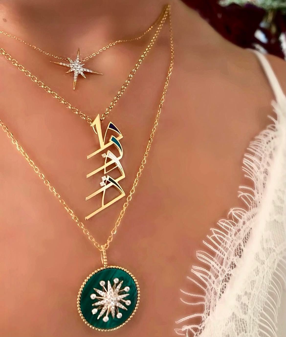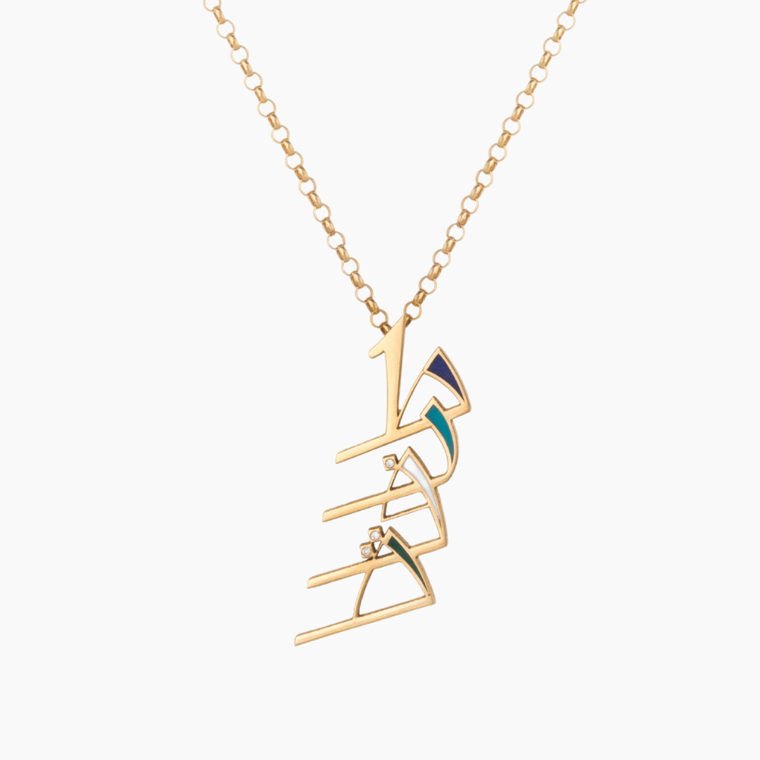 18kt yellow gold personalized calligraphy necklace with enamel and white Diamonds.