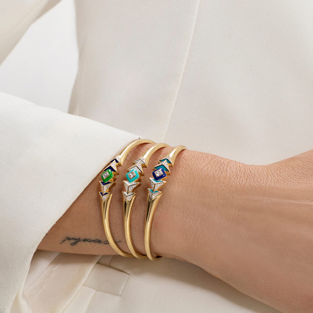 18kt yellow gold bangle with triangle shapes crafted with royal blue enamel, set with white Diamonds and cubic shape in the center coated with emerald green enamel set with a princess cut Diamond.