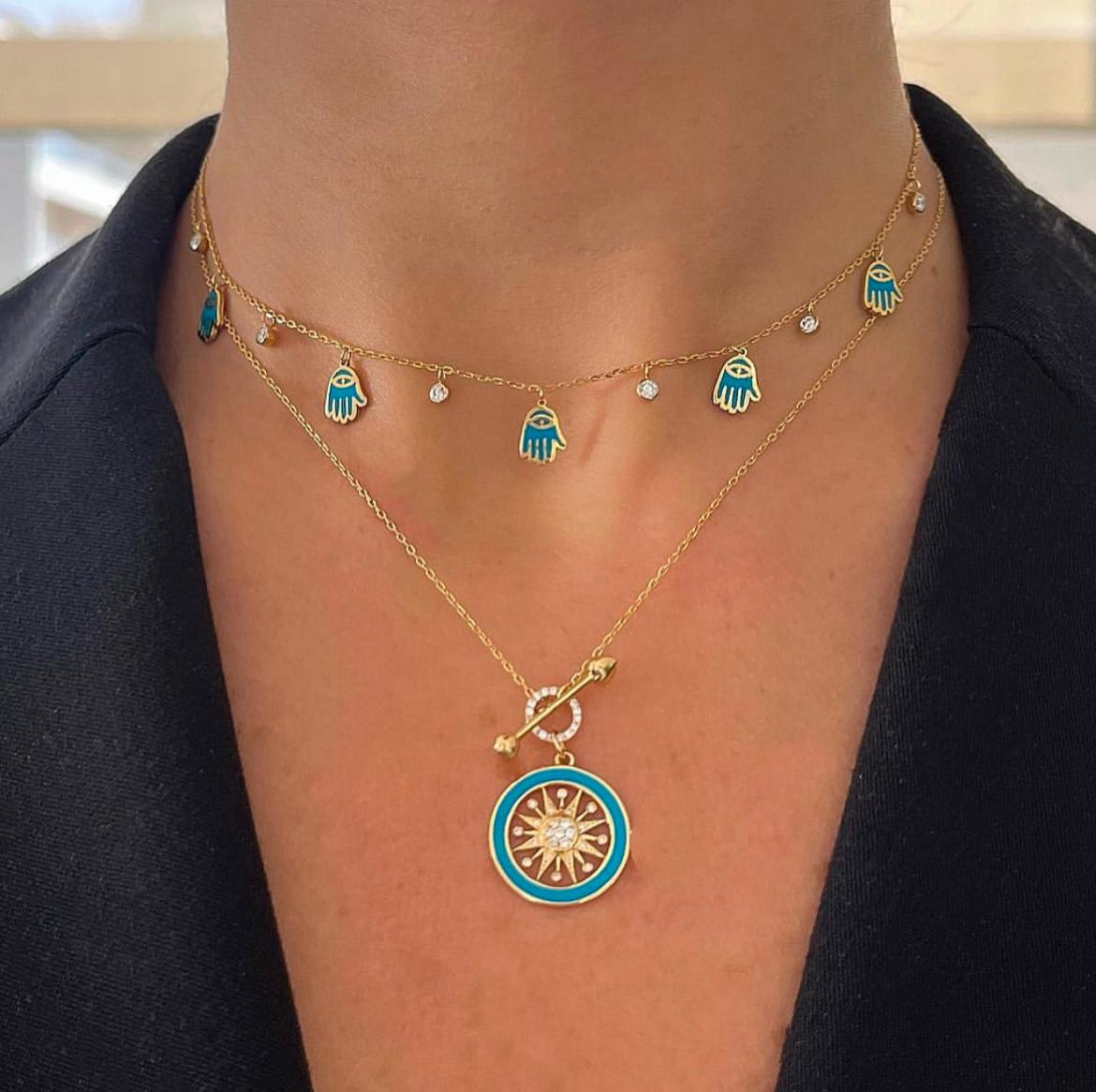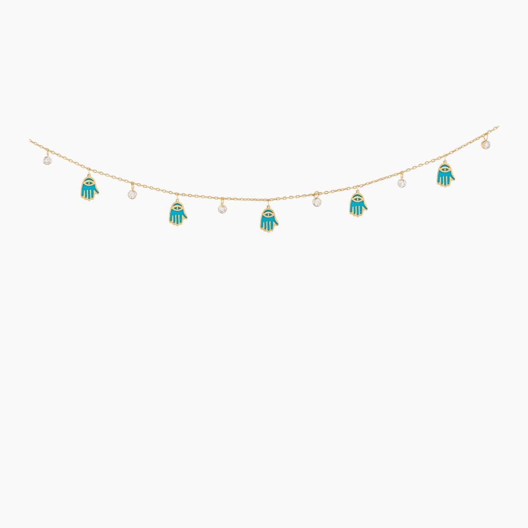 18kt yellow gold hand of Fatima choker necklace with turquoise enamel and white Diamonds.